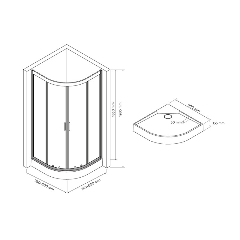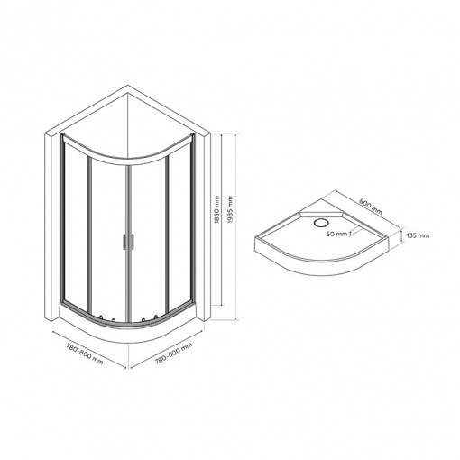 Комплект содержит: поддон размером 80х80 см (1 шт), сифон под поддон (1 шт), стеклянные двери (2 шт), ручки для стеклянных дверей (2 шт), двойные ролики для стеклянных дверей (2 пары), стеклянные передние стенки (2 шт), вертикальный профиль (2 шт), горизонтальный профиль (2 шт), водозащитный уплотнитель (4 шт), магнитный уплотнитель (2 шт).