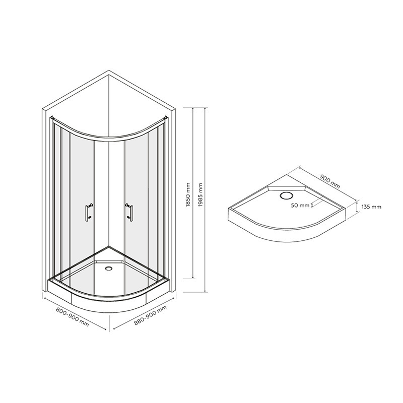 Комплект содержит: поддон размером 90х90 см (1 шт), сифон под поддон (1 шт), стеклянные двери (2 шт), ручки для стеклянных дверей (2 шт), двойные ролики для стеклянных дверей (2 пары), стеклянные передние стенки (2 шт), вертикальный профиль (2 шт), горизонтальный профиль (2 шт), водозащитный уплотнитель (4 шт), магнитный уплотнитель (2 шт).