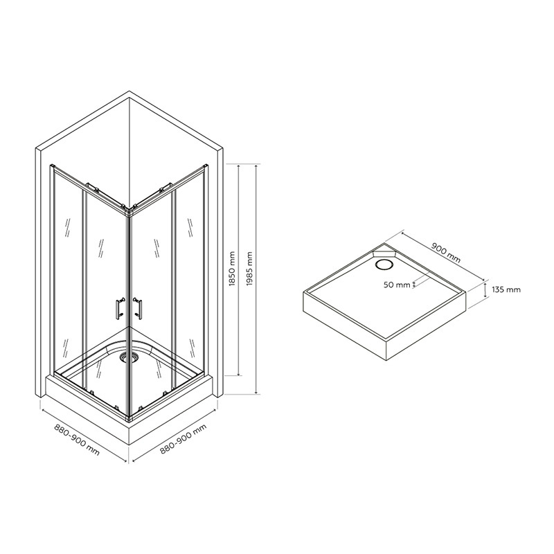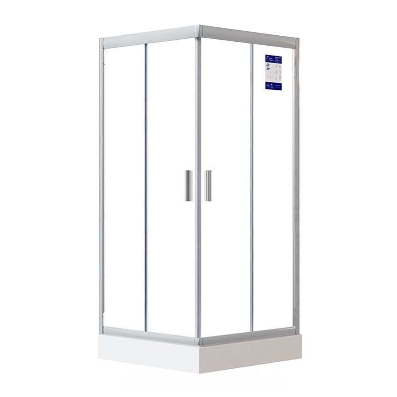 Комплект содержит: поддон размером 90х90 см (1 шт), сифон под поддон (1 шт), стеклянные двери (2 шт), ручки для стеклянных дверей (2 шт), двойные ролики для стеклянных дверей (2 пары), стеклянные передние стенки (2 шт), вертикальный профиль (2 шт), горизонтальный профиль (2 шт), водозащитный уплотнитель (4 шт), магнитный уплотнитель (2 шт).