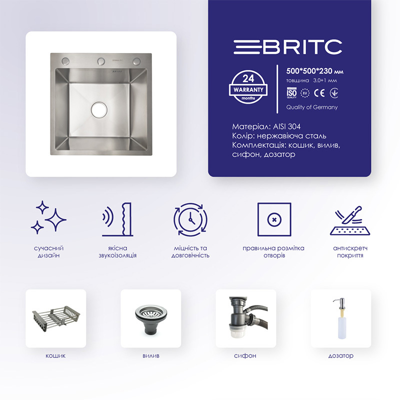 Мойка Britc HM HS5050 комплектуется корзиной, дозатором моющего средства, сифоном и сетчатым изливом.