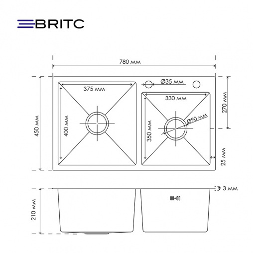 Кухонная мойка Britc HM HS7845_20, на 2 чаши, нержавейка