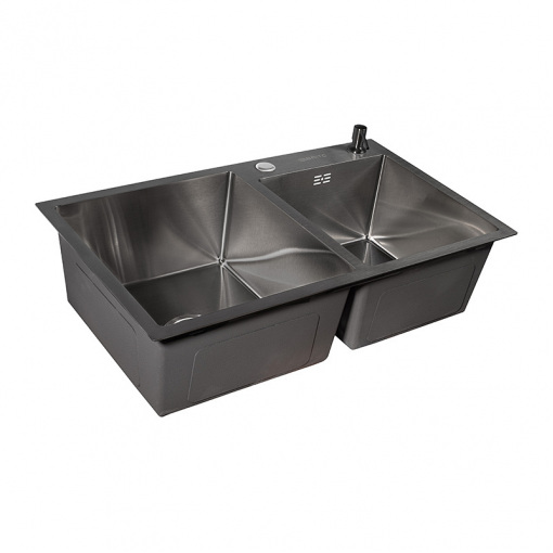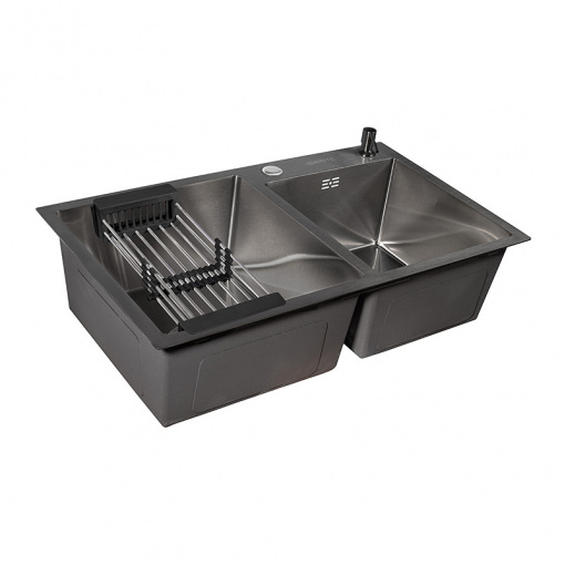 Мойка HM HS7845_20, двойная, черная комплектуется сифоном с 2-мя изливами, корзиной-сушкой и дозатором моющего средства.