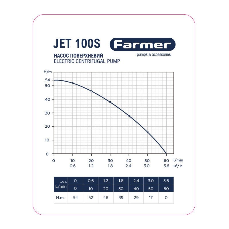 Основные характеристики поверхностного насоса Jet 100 S 1.1 кВт, H 54м, Q 55л/мин: