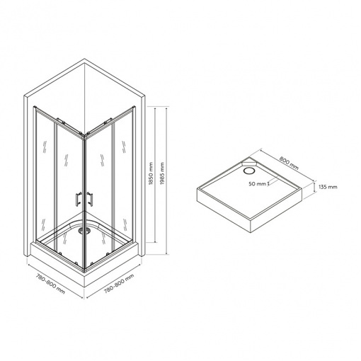 Ця квадратна душова кабіна з піддоном оснащена елегантними ручками, подвійними хромованими роликами зверху та знизу, які мають систему легкого зняття. Крім того, суцільні настінні профілі забезпечують надійність і полегшують очищення. Дверцята душової кабіни виготовлені з міцного загартованого скла товщиною 6 мм. Піддон виготовлений з високоякісного акрилу, армованого скловолокном і укріпленого поліефірними смолами. Він оснащений металевим каркасом із ребрами жорсткості, що підвищує загальну міцність. Також піддон має регульовані ніжки, які спрощують процес встановлення та налаштування правильного кута нахилу.