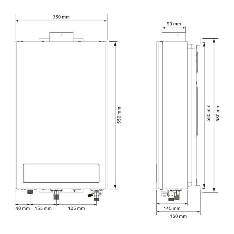 - Приєднувальні з’єднання: Вхід/Вихід води - G1/2, Вхід газу - G1/2