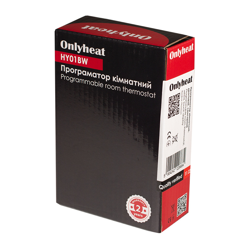 Регулятор Onlyheat HY01BW є дротовим приладом та обладнаний сенсорним екраном для зручного налаштування. Вбудований безотенційний контакт дозволяє передавати команди на увімкнення або вимкнення нагрівального приладу. Також даний програматор має великий LED-дисплей, на якому відображається температура в приміщенні.