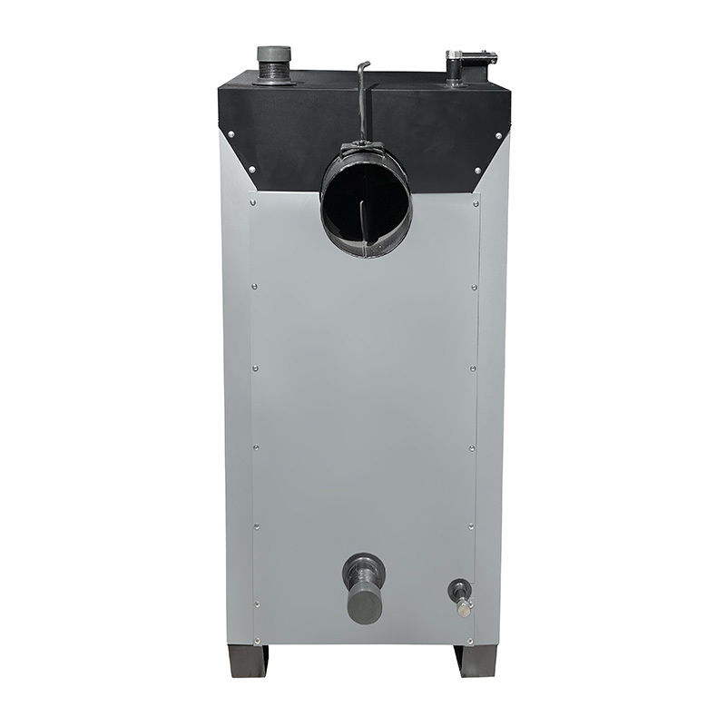 На задній стінці корпусу котла закріплений димар з шибером. У даній моделі передбачено вхід під вентилятор, розташований спереду, зверху та з бокової частини корпусу. Також, позаду розміщений зливний патрубок.