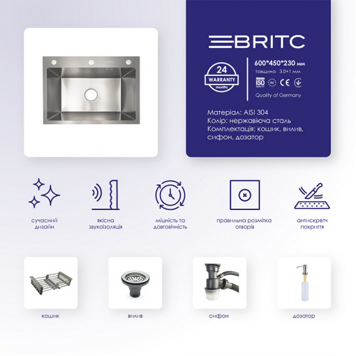 Кухонна мийка з нержавіючої сталі Britc це ідеальне рішення для сучасної кухні, де цінується якість, функціональність та практичність, адже вона поєднує довговічність матеріалу, зручність у догляді та естетичний зовнішній вигляд, гармонійно вписуючись у будь-який інтер'єр.
