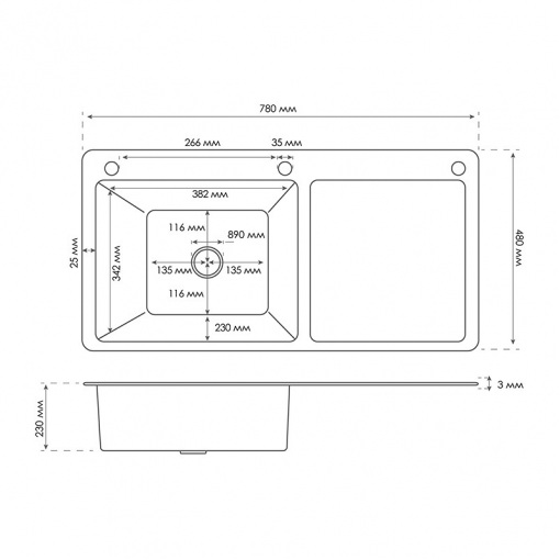 В мийці передбачено 3 отвори для встановлення змішувача, дозатора для мийного засобу або інших додаткових аксесуарів, підвищуючи функціональність робочої зони на кухні. Завдяки універсальному дизайну та простому монтажу, мийка легко інтегрується в будь-яку стільницю, а сучасний вигляд надає кухні елегантності та охайності.