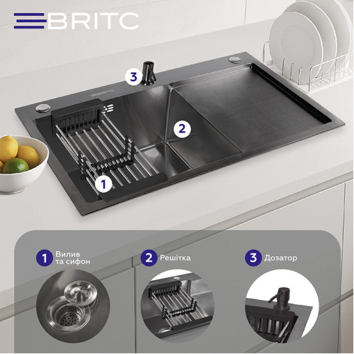 Кухонна мийка з нержавіючої сталі Britc це ідеальне рішення для сучасної кухні, де цінується якість, функціональність та практичність, адже вона поєднує довговічність матеріалу, зручність у догляді та естетичний зовнішній вигляд, гармонійно вписуючись у будь-який інтер'єр.