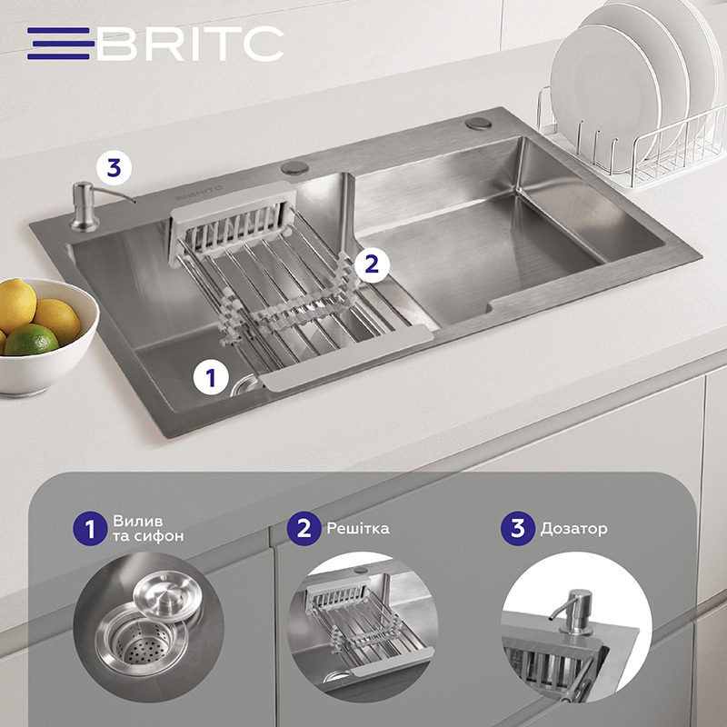 Кухонна мийка з нержавіючої сталі Britc це ідеальне рішення для сучасної кухні, де цінується якість, функціональність та практичність, адже вона поєднує довговічність матеріалу, зручність у догляді та естетичний зовнішній вигляд, гармонійно вписуючись у будь-який інтер'єр.