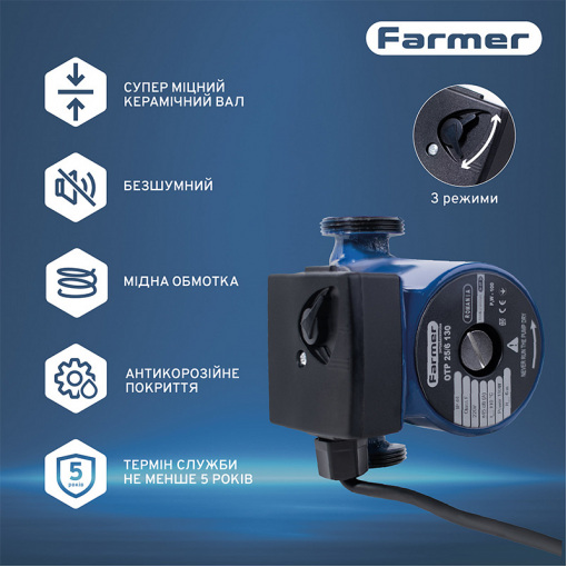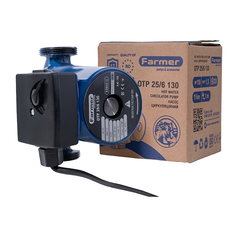 Циркуляційні насоси Farmer призначенні для забезпечення безперебійної примусової циркуляції робочих рідин (теплоносіїв) в закритих і відкритих системах опалення приміщень.
