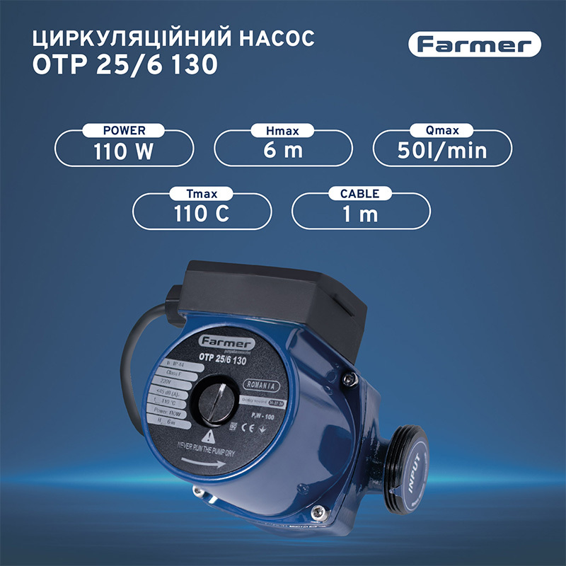 Насос циркуляційний Farmer 25/6-130, 110 кВт, H 6м Q 50л/хв