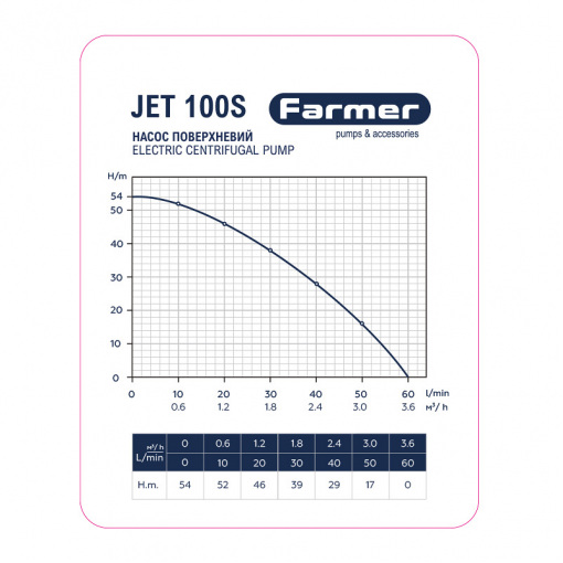 Основні характеристики поверхневого насоса Jet 100 S 1.1 кВт, H 54м, Q 55л/хв: